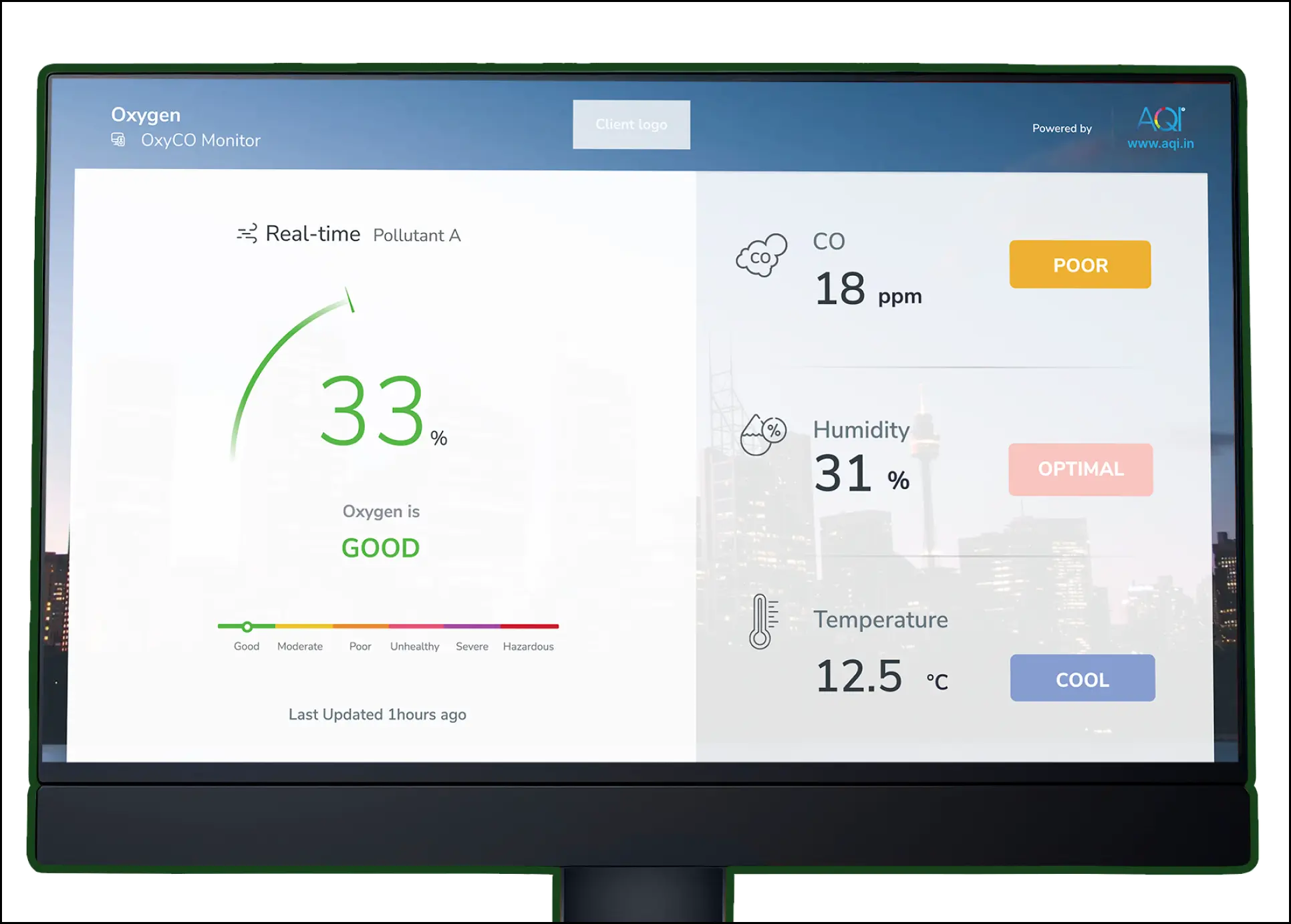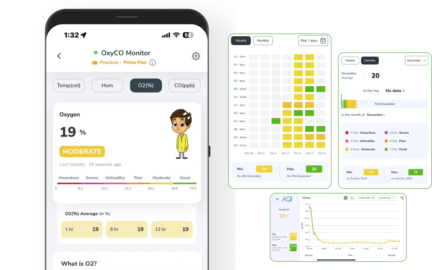 Monitor Oxygen, Carbon Monoxide, humidity, and temperature in real-time.